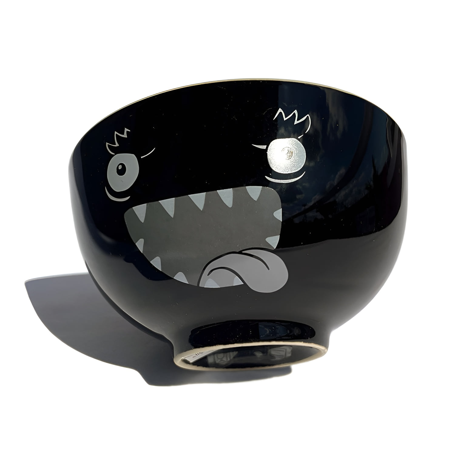 Eine glänzend schwarze Müslischale mit einem superwitzigen Monstergesicht.